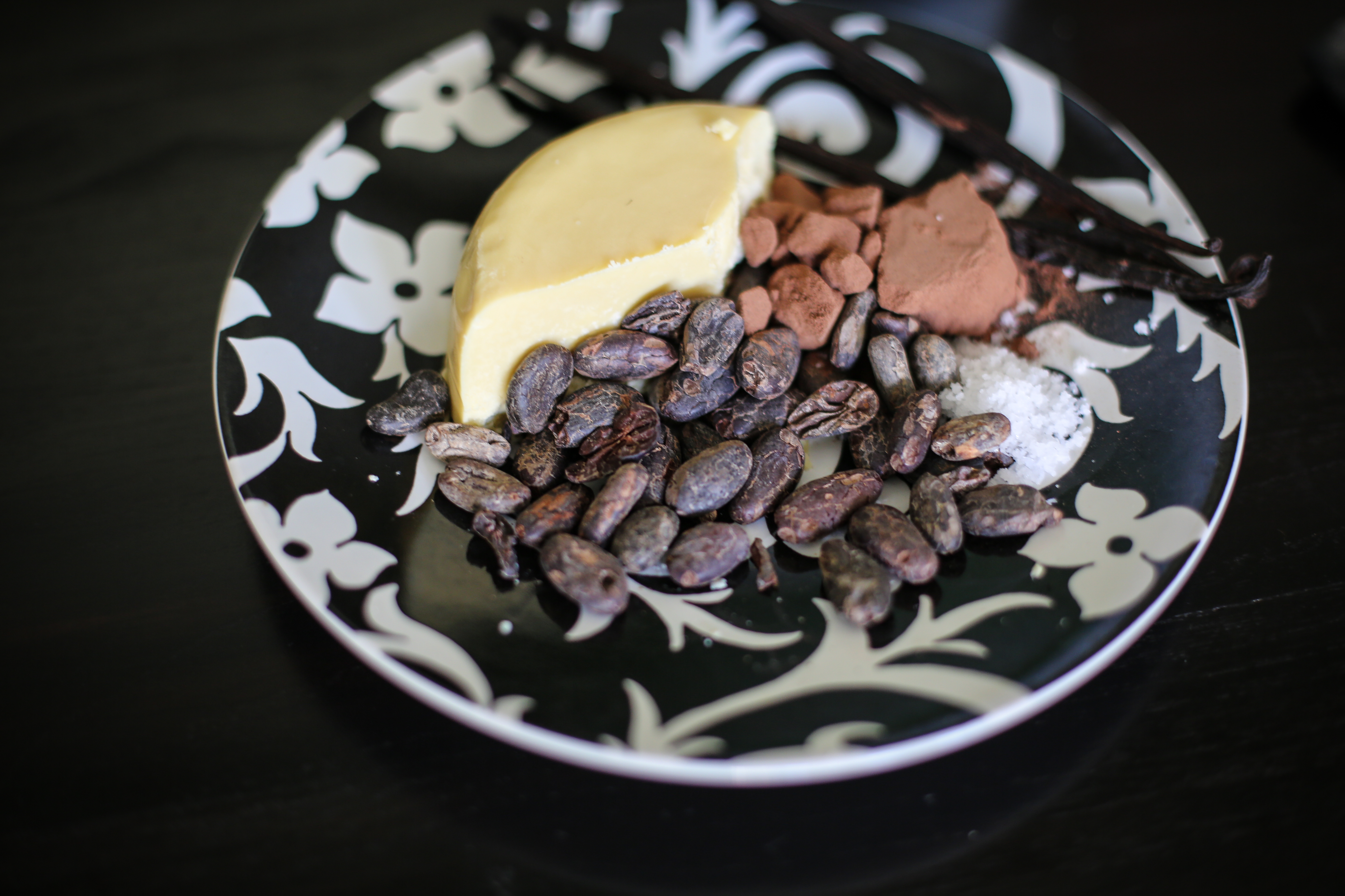 Raw chocolate is made in a blender, as is a lot of raw dessert, so it isn’t heated. We added raw cacao powder to melted raw cacao butter, coconut oil, some vanilla beans, a bit of organic palm sugar syrup, and a pinch of salt. Then we just blended it up until it was smooth (There is a point when it’s blended too far and starts to separate again, so be careful if you try it at home). Before it was all devoured on top of strawberries, we poured some of it into little chocolate molds and added some orange, nuts, and berries before popping it into the fridge to set.