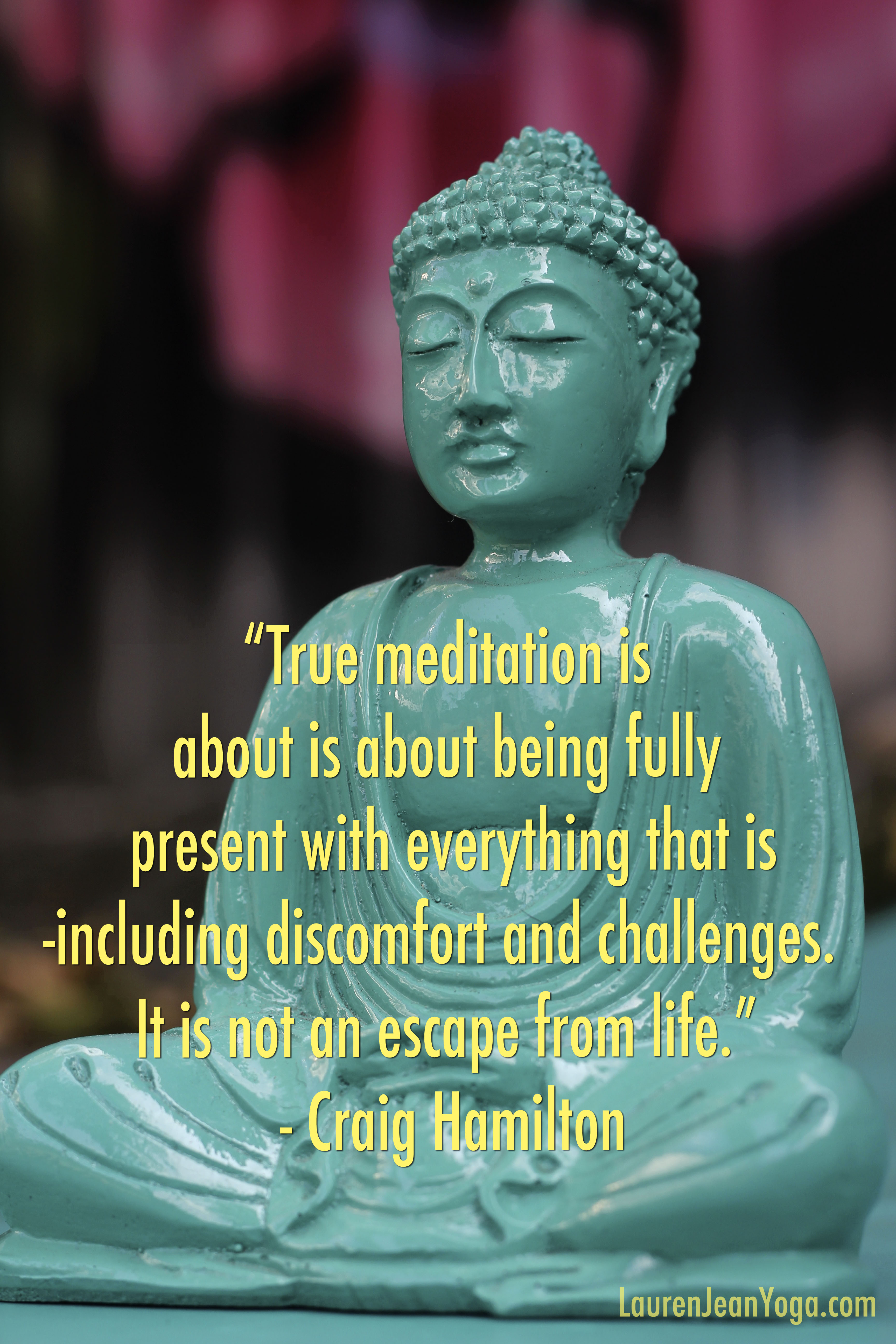 I used to think meditation was simply letting my mind go blank. That I was supposed to think of nothing and somehow this nothingness would bring me to that state of zen, or whatever it was people talked about. Honestly, I’ve always struggled with meditation, at least in the sit down and set aside this time to meditate sort of way. It’s tricky for me to clear my mind and sit still for long periods of time like that and feel like it’s accomplishing something. Mostly I end up following my mind off on tangents then berating myself for getting off on a tangent and then trying to force my mind back to some sort of peace. Not helpful or peaceful! What I’ve learned through my, often sporadic, meditation practice is that A: It takes practice and exercise to strengthen the “muscles” involved in meditation, and B: my mind doesn’t have to be blank! I can have thoughts, and insights, and follow little tangents. It happens. What is most important is that I keep trying, and trying, and then try some more, to carve out that space to just be with myself, alone in my own mind space. So what I like so much about this quote, is that though I’m not always (or perhaps ever for that matter) “fully present”, I can be at peace with all the discomfort and the challenges that I’m facing, both in life and in my meditation practice. One day maybe I’ll find a place where things are quieter up in my head, and maybe not. All I can do is be present one moment at a time.